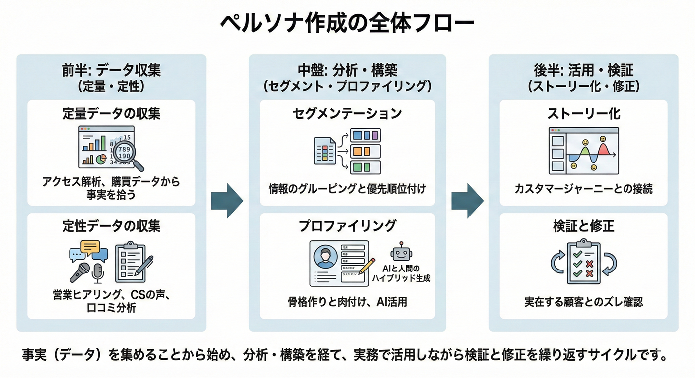 重要なのは、ペルソナを「こうあってほしい顧客(願望)」ではなく、「実際にこう行動した顧客(事実)」から作ることです。