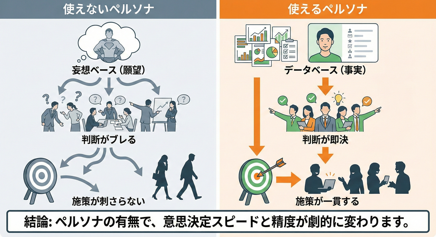 ペルソナの本当の役割は、チーム全員が「このデザインは、あの人(ペルソナ)にとって正しいか?」「このコピーは、あの人の不安を解消できるか?」と、主観ではなく共通の基準で即断できる状態をつくることにあります。