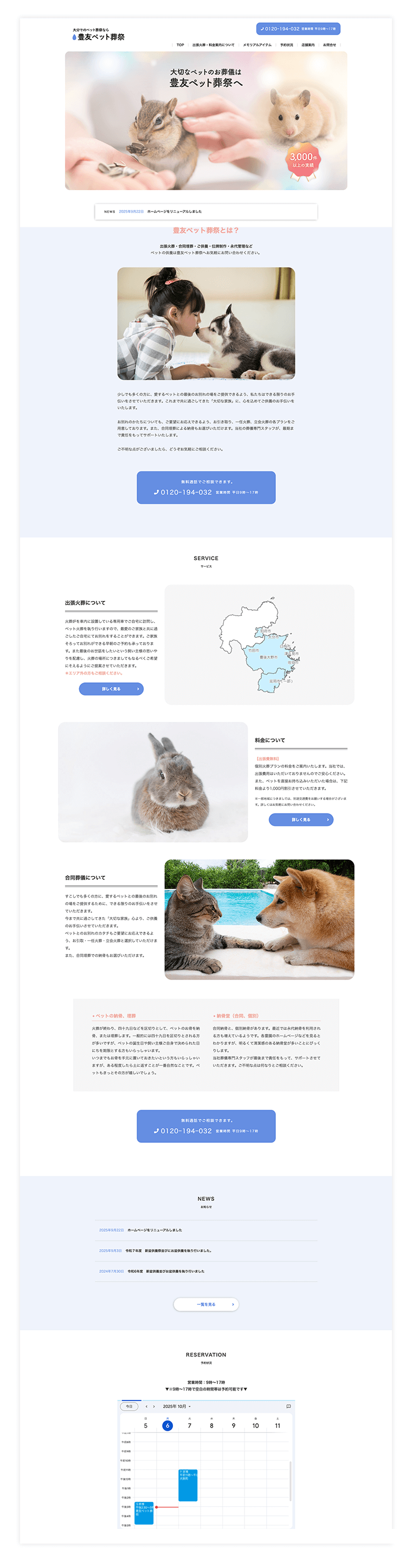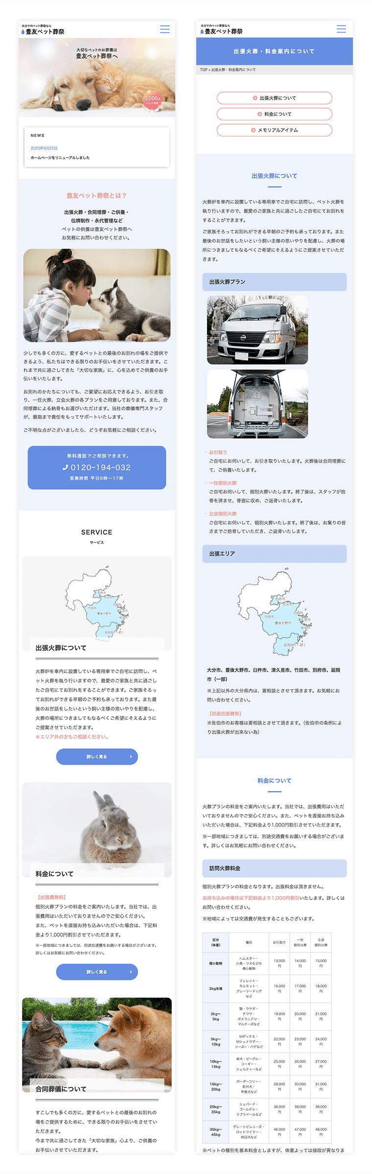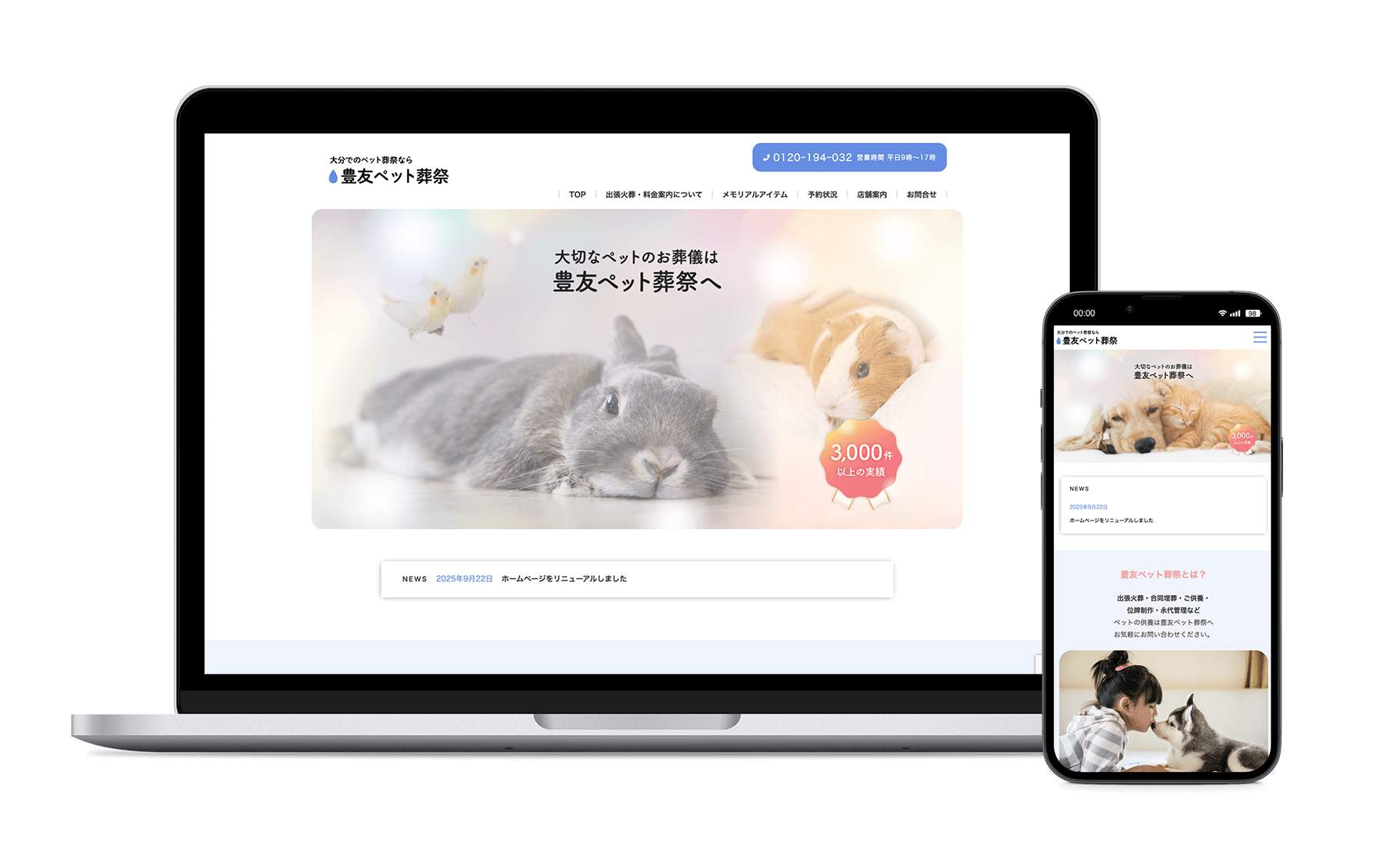 | 備考 | 大分県豊後大野市、県南地区を中心に、大切な家族であるペットの火葬・供養サービスを提供されている豊友ペット葬祭様の公式サイトリニューアルをいたしました。 リニューアル前は、数年前に制作されたサイトデザインの陳腐化が進み、特にスマートフォンでの閲覧に対応していない点が大きな課題となっていました。多くのユーザーがスマートフォンで情報を検索する現代において、機会損失に繋がる可能性があったため、今回のリニューアルでは、まずデザインの一新とレスポンシブ対応を最優先事項としました。 サイト全体をスマートフォンでも快適にご利用いただけるよう、ユーザーファーストを意識した設計とデザインを施しました。また、メインビジュアルには、豊友ペット葬祭様の信頼性と安心感を伝えるため、これまでの火葬・供養の実績を明確に掲載。さらに、視覚的に訴求できるよう、火葬に対応可能な動物の種類をスライドで表示させることで、サービス内容を直感的に理解していただける工夫を凝らしています。 リニューアル後、ユーザー様からは「スマートフォンでとても見やすくなった」「安心して依頼できると感じた」といったお声をいただいており、目的としていたユーザー体験の向上に貢献できたことを大変嬉しく思います。 |